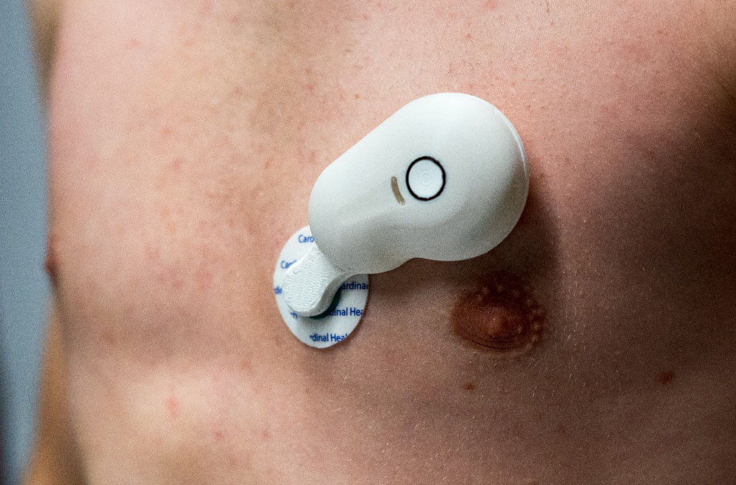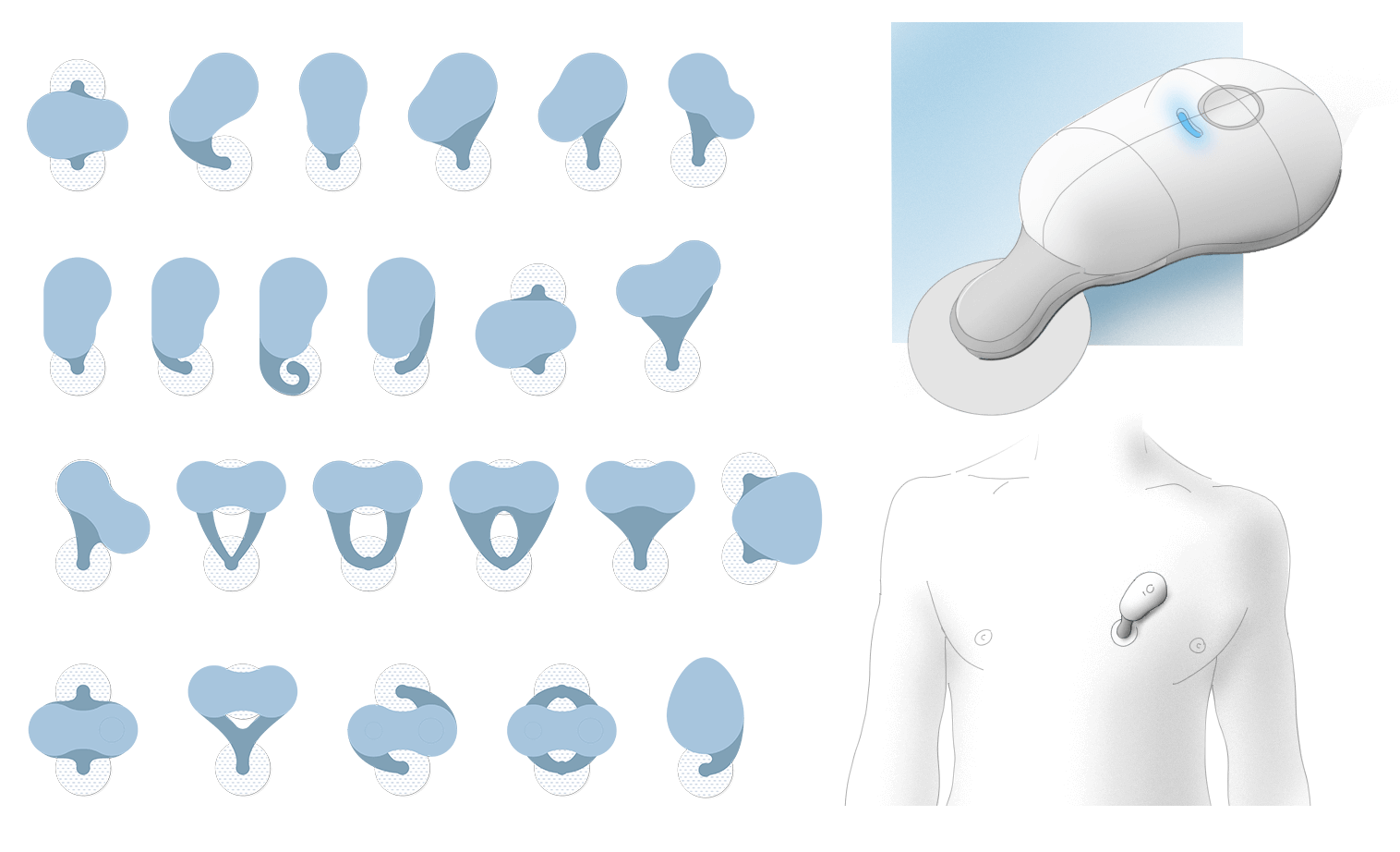 After the research was completed, the ideation phase began. The shape of Biomeon was based on our research into the likely size of the electronics and the optimal distance between ECG patches. Additionally, several moodboards were created to align with patients' preferences for the type of device they would feel comfortable wearing. Eventually users chose the final shape we continued with as it was playful and fitted well with the body's contours.